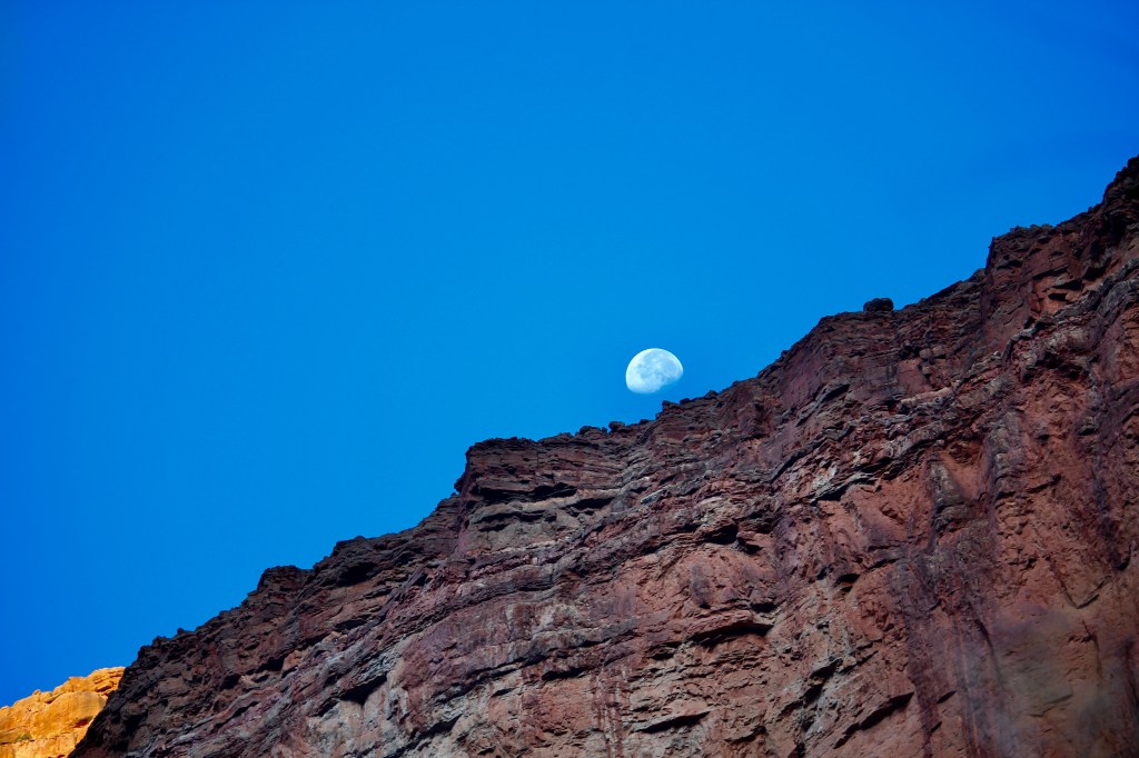 Sometime around midnight I woke up, sort of. The sound of the water, stirred memories of a recent flash flood that had swept through a town in Texas, taking with them a camp full of young girls. The smell of the fire and the hot night combined with my body becoming dehydrated and it all overwhelmed my system. In the darkness, I truly felt like I was about to be swept away by both water and fire. Reality and my imagination battled. I was able to gather my senses enough to call out to my daughter who brought me gatorade and covered me with a wet towel to bring down my temperature. Our mind can play strange games with us at midnight in the wilderness. I now understood my mother’s fears and experienced some more of my own. But then a little miracle happened. My body balanced itself. My temperature cooled, the moon began to rise above the canyon wall. Light filled the sky. The rushing waters sounded more like gentle waves, and I felt peace. Total peace. My fears all quickly abated.