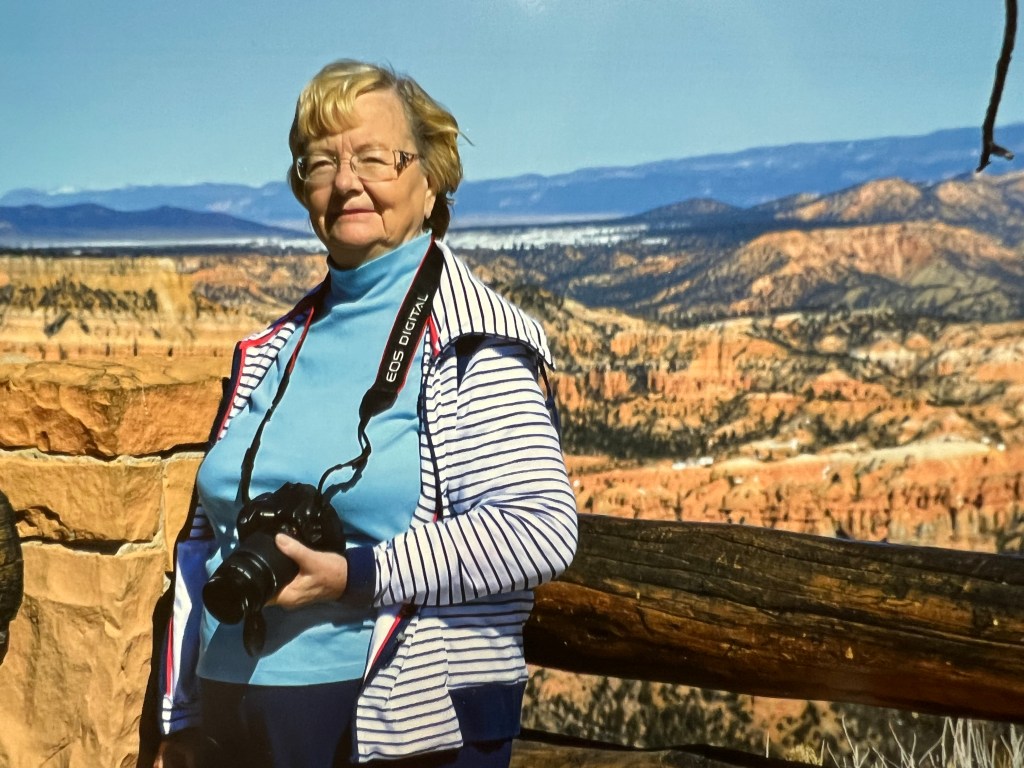 While living in Arizona she developed a deep love for the Grand Canyon. She honeymooned there and returned to its rims several times. She was a lover of wide open space and expansive views. She loved Bryce Canyon and Cedar Breaks in Utah. She often would stop at look outs and view areas so we could take it all in. She loved the contrast of Red Rocks and Blue Skies most of all.
